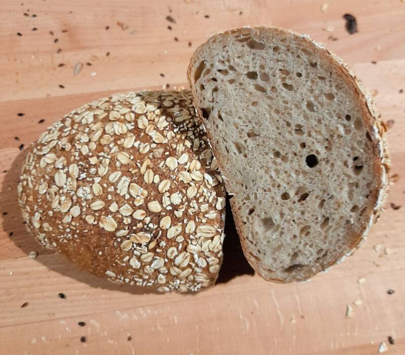 Een tarwe-havermoutbrood op basis van desem met een beetje honing en beurre noisette (bruine boter). De basis bestaat uit in melk gekookte volkoren havermoutvlokken.
