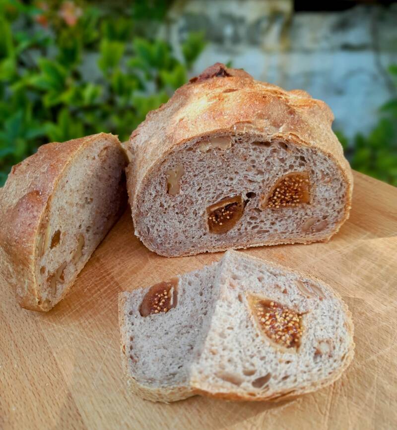 Een bruinbrood (50 procent volkoren) met lichtzoete stukjes vijg en versgebrande walnoot. De korst van dit hybride brood (gemaakt met een beete gist én met roggedesem) is extra krokant door de suikers uit de Turkse vijgen. Helemaal lekker als je 'm toast, of eet met blauwe kaas of een salade.