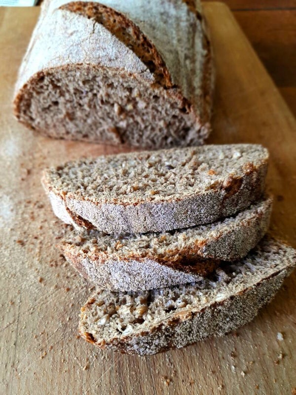 Een heerlijk, langwerpig Bakenesser bruinbrood (60 procent volkoren) met zaden op de korst.